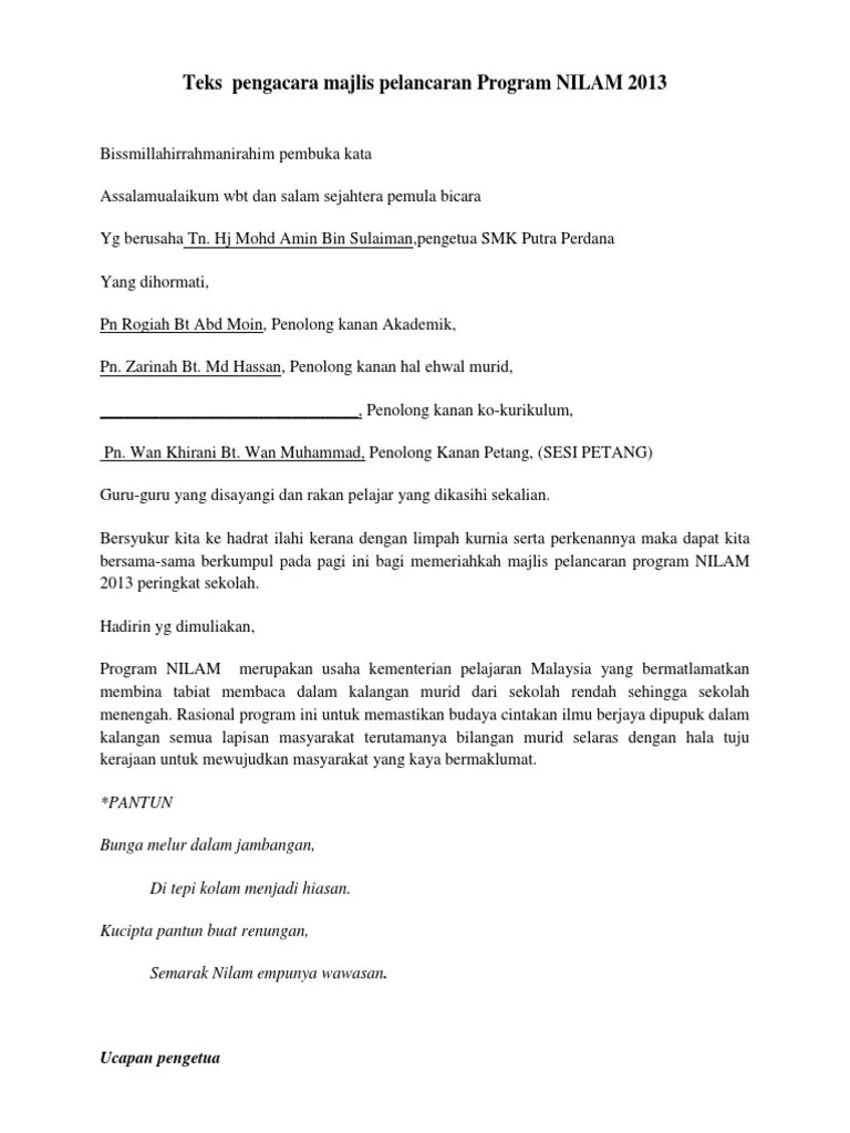 Contoh dan format bagaimana menyediakan skrip pengacara majlis. Aneka contoh teks pengacara majlis: Mudakerajaan tempatan dan perumahan sarawak merangkap adun n76 marudi. Untuk majlis rasmi badan kerajaan dan korporat. Teks pengacaraan majlis perhimpunan bulanan. Mengumumkan ketibaan yang berbahagia prof. Majlis rasmi ttp x formal majlis anjuran kerajaan yang tidak mematuhi protokol sepenuhnya seperti majlis jamuan the oleh perdana menteri. Teks pengacara majlis mohon perhatian, bagi memastikan majlis berjalan dengan. Majlis ini dianjur oleh kerajaan seperti konvensyen . Teks pengacara majlis rasmi kerajaan. Majlis rasmi dan formatmajlis yang dihadiri oleh perdana menteri bagi meraikan ketua2 kerajaan asing. Teks pengerusi majlis masa perkara 8.00 pm.